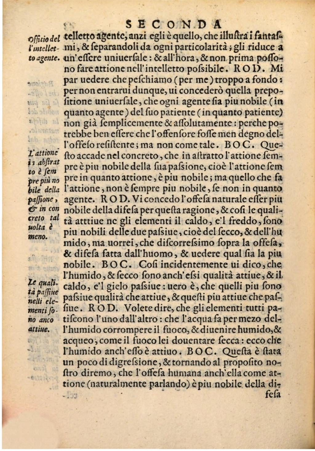 Offitio del telletto agente, anzi egli è quello, che illuftra i fantafl'intellet- mi , & feparandoli da ogni particolarità ; gli riduce a to agente. un'effere uniuerfale : & all'hora , &non prima poſſo→ no fare attione nell'intelletto pofsibile . ROD . Mi par uedere che pefchiamo ( per me ) troppo a fondo : per non entrarui dunque, ui concederò quella prepofitione uniuerfale , che ogni agente fia piu nobile ( in. quanto agente ) del fuo patiente ( in quanto patiente) non già femplicemente & affolutamente : perche potrebbe ben effere che l'offenfore foffe men degno dell'offefo refiftente ; ma non come tale . BOC . QueL'attione fto accade nel concreto , che in aftratto l'attione femin abftrat to è fem pre è piu nobile della fua pafsione, cioè l'attione fem prepiù no pre in quanto attione , è piu nobile ; ma quello che fa bile della l'attione , non è fempre piu nobile , fe non in quanto paffione , agente. ROD. Vi concedo l'offefa naturale effer piu &in con nobile della difefa per quefta ragione , & cofi le qualicreto tal tà atttiue nc gli elementi il caldo , e'l freddo , fono nolta è piu nobili delle due pafsiue , cioè del fecco , & dell'hu meno. mido , ma uorrei , che difcorrefsimo fopra la offefa , & difeſa fatta dall'huomo , & uedere qual fia la piu nobile . BOC . Cofi incidentemente ui dico , che l'humido , & fecco fono anch'essi qualità attiue , & il Le quali- caldo , e'l giclo pafsiue : uero è , che quelli piu fono tàpaffiue nelli ele- pafsiue qualità che attiue , & quefti piu attiue che pafmentifo- fiue . ROD. Volete dire, che gli elementi tutti pano anco tifcono l'uno dall'altro : che l'acqua fa per mezo delattine. l'humido corrompere il fuoco, & diuenire humido , & acqueo , come il fuoco lei douentare fecca : ecco che l'humido anch'effo è attiuo . BOC. Questa è ſtata un poco di digrefsione , & tornando al propofito noftro diremo , che l'offefa humana anch'ella come attione (naturalmente parlando) è piu nobile della difefa