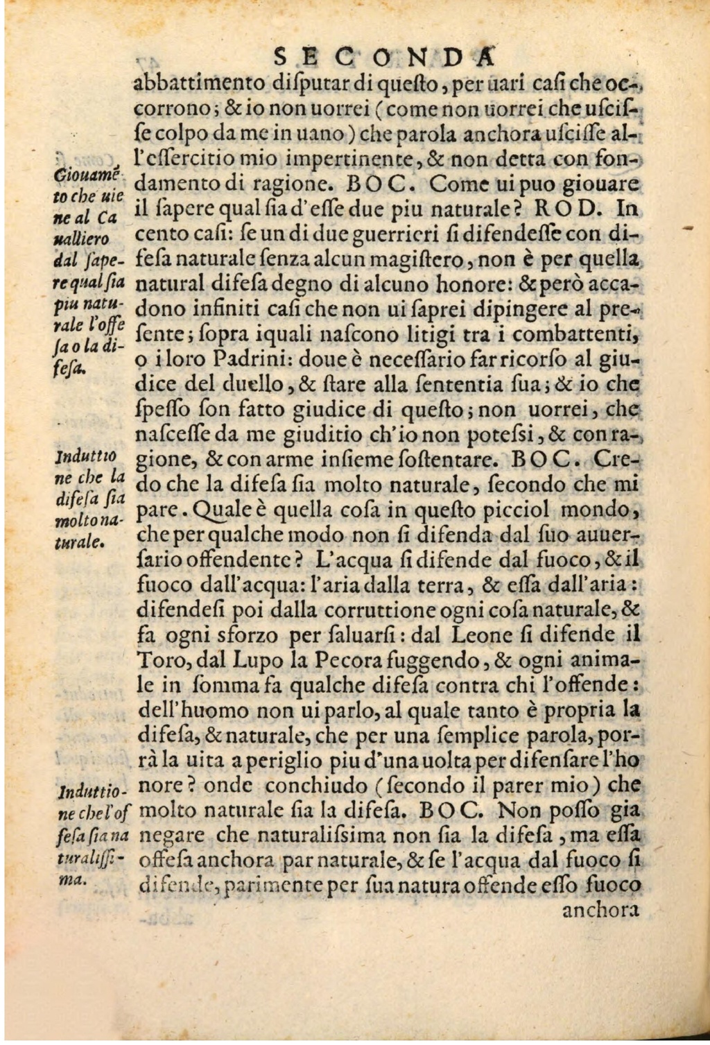 SECONDA abbattimento difputar di quefto , per uari cafi che oc corrono ; & io non uorrei ( come non uorrei che ufciffe colpo da me in uano ) che parola anchora ufciffe all'effercitio mio impertinente , & non detta con fonGiouame damento di ragione. BOC . Come ui puo giouare to che nie ne al Ca il fapere qual fia d'effe due piu naturale ? ROD. In cento cafi: fe un di due guerricri fidifendeffe con diualliero dal fape- fefa naturale ſenza alcun magiſtero , non è per quella requalfia natural difefa degno di alcuno honore: & però accapiù natu- dono infiniti cafi che non ui faprei dipingere al pre rale l'offe fente ; fopra iquali nafcono litigi tra i combattenti , Ja o la dio i loro Padrini : doue è neceffario far ricorfo al giufefa. dice del duello , & ftare alla fententia fua ; & io che fpeffo fon fatto giudice di queſto ; non uorrei , che nafceffe da me giuditio ch'io non potefsi , & con ra gione, & con arme infieme foftentare. BOC . Crene che la do che la difefa fia molto naturale , fecondo che mi difefa fia moltona Pare . Quale è quella cofa in questo picciol mondo , che per qualche modo non fi difenda dal fuo auuerturale. fario offendente ? L'acqua fi difende dal fuoco , & il Induttio