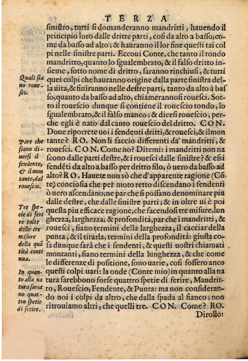 1 principio loro dalle dritte parti , cofi da alto a baffo; coine da baffo ad alto ; & hauranno il lor fine quefti tai col pi nelle finiftre parti. Eccoui Conte, che tanto il tondo mandritto,quanto lo fgualembrato , & il falfo dritto infieme , fotto nome di dritto , faranno rinchiufi , & tutti Qualifia quei colpi che hauranno origine dalla parte finiftra delno roue la uita, & finiranno nelle deftrc parti, tanto da alto à baf fci. fo,quanto da baffo ad alto , chiamerannofi rouefci . Sotto il rouefcio dunque ficontiene il rouefcio tondo , lo fgualembrato, & il falfo manco ; & dicefi rouefcio , perche egli è nato dal canto rouefcio del dritto . CON . Doue riporrete uoi i fendenti dritti, & rouefci, & ilmon Pare che tante ? RO. Non li faccio differenti da' mandritti , & fiano di- rouefci. CON. Come no? Ditemi : i mandritti non na uerfi il