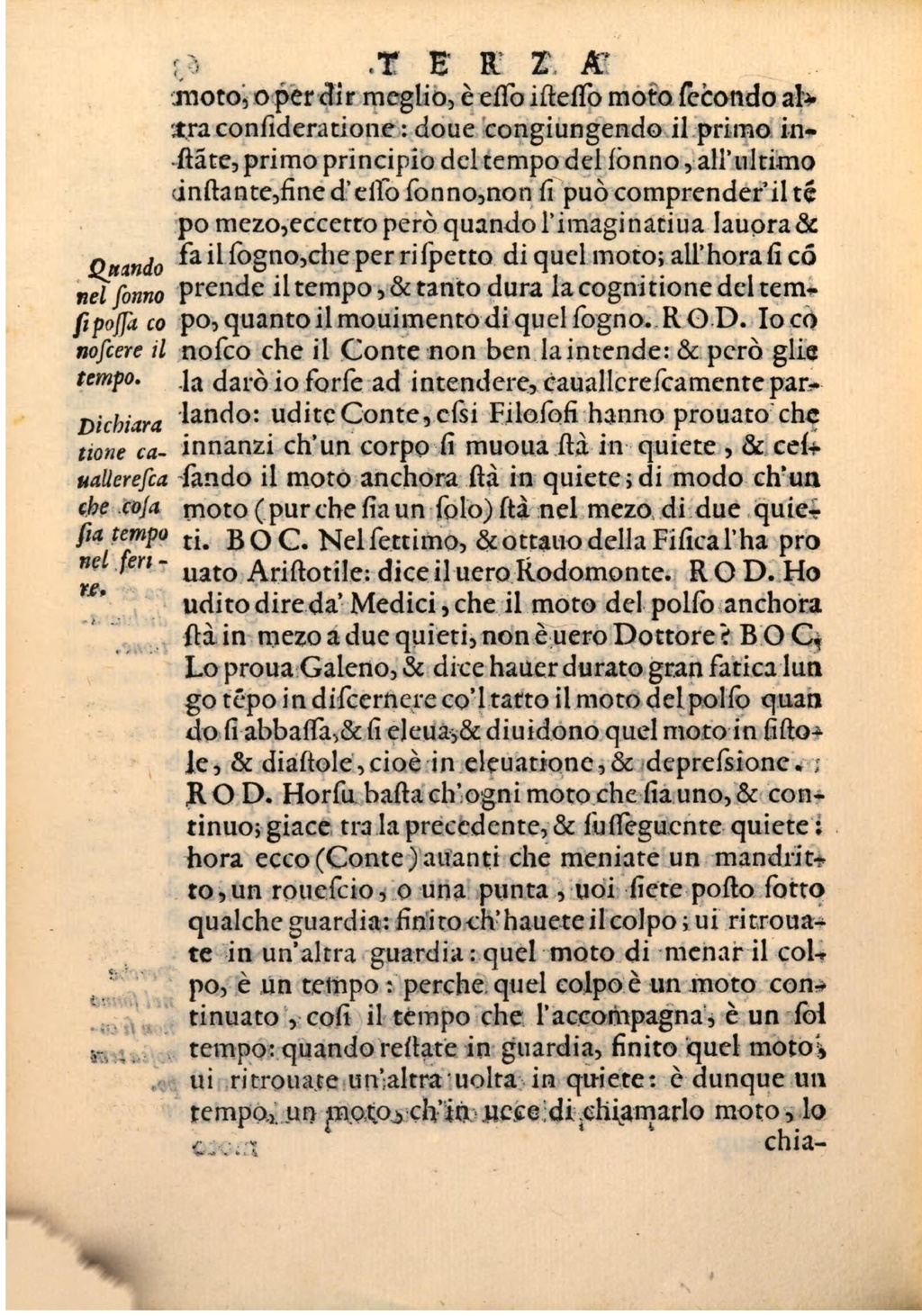 TERZ. A moto, oper dir meglio, è effo ifteffo moto fecondo alə tra confideratione : doue congiungendo il primo inftate, primo principio del tempo del founo , all'ultimo inftante,fine d'effo fonno, non fi può comprender'il té po mezo,eccetto però quando l'imaginatiua lauora & fa il fogno, che per rispetto di quel moto; all'hora fi cá Quando nel founo prende il tempo , & tanto dura la cognitione del tem fipoffa co po, quanto il mouimento di quel fogno . ROD. Io ca nofcere il nofco che il Conte non ben da intende: & però glio tempo. la darò io forfe ad intendere, cauallerefcamente par Dichiara lando: udite Conte , cfsi Filofofi hanno prouato che tione ca- innanzi ch'un corpo fi muoua ftà in quiete , & cel ualleresca fando il moto anchora ſtà in quiete ; di modo ch'un che cofa