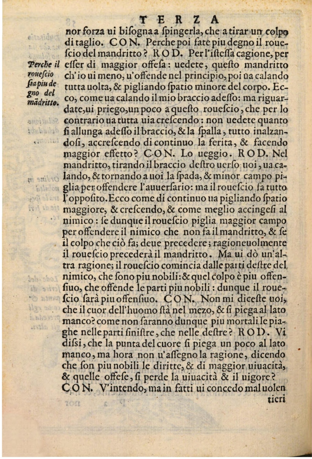 ROD. Per l'istessa cagione, per esser di maggior offesa: vedete, questo mandritto ch'io vi meno, v'offende nel principio, poi va calando tutta volta, & pigliando spatio minore del corpo. Ecco, come va calando il mio braccio adesso: ma riguardate, vi priego, un poco a questo rovescio, che per lo contrario va tutta via crescendo: non vedete quanto si allunga adesso il braccio, & la spalla, tutto inalzandosi, accrescendo di continuo la ferita, & facendo maggior effetto?