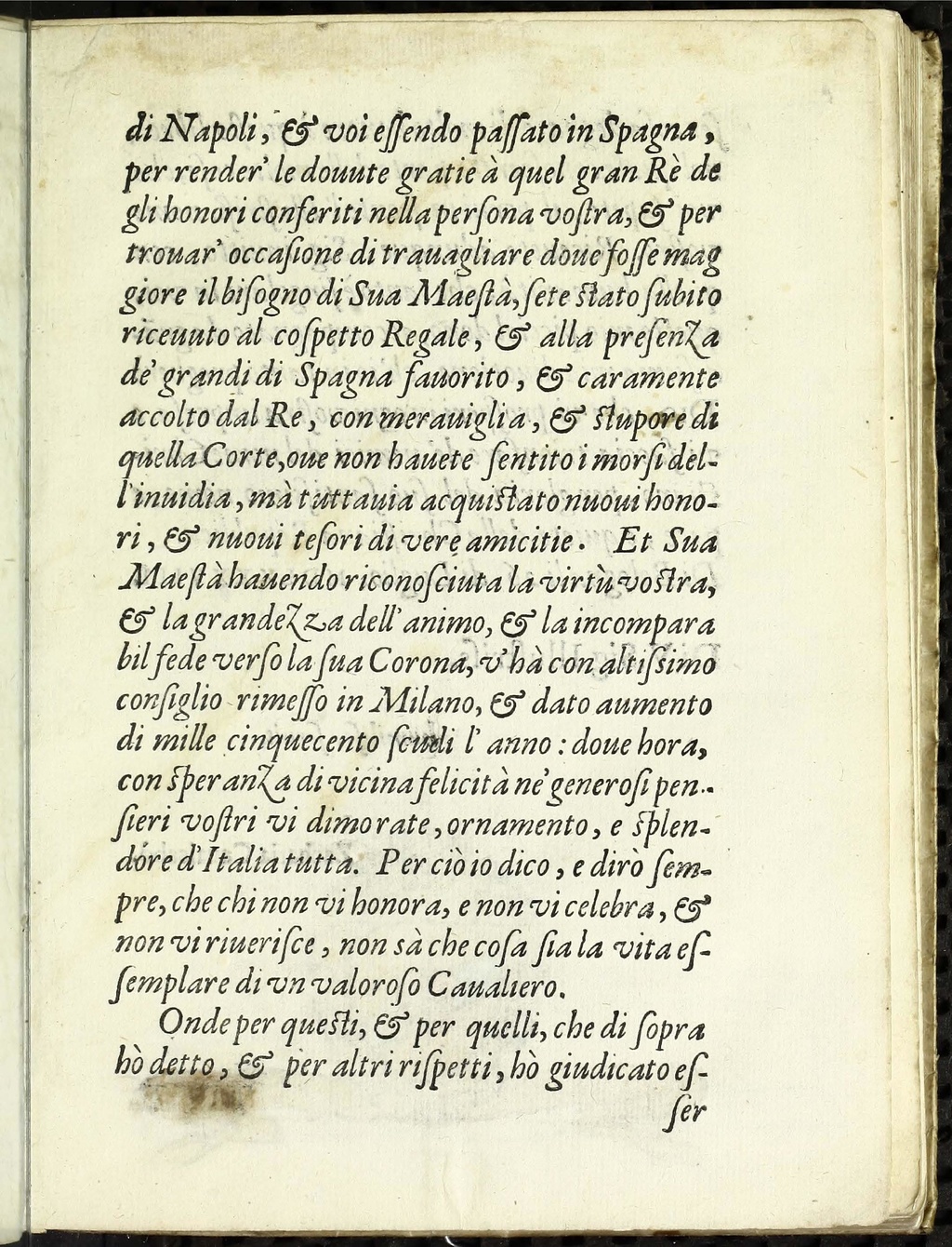 di Napoli, & voi essendo passato in Spagna, per render' le dovute gratie à quel gran Rè de gli honori conferiti nella persona vostra, & per trovar' occasione di travagliare dove fosse maggiore il bisogno di Sua Maestà, sete stato subito ricevuto al cospetto Regale, & alla presenZa de' grandi di Spagna favorito, & caramente accolto dal Re, con meraviglia, & stupore di quella Corte, ove non havete sentito i morsi dell'invidia, mà tuttavia acquistato nuovi honori, & nuovi tesori di vere amicitie. Et Sua Maestà havendo riconosciuta la virtù vostra, & la grandeZza dell'animo, & la incompara bil fede verso la sua Corona, v'hà con altissimo consiglio rimesso in Milano, & dato aumento di mille cinquecento scudi l'anno: dove hora, con speranZa di vicina felicità ne'generosi pensieri vostri vi dimorate, ornamento, e splendore d'Italia tutta. Per ciò io dico, e dirò sempre, che chi non vi honora, e non vi celebra, & non vi riverisce, non sà che cosa sia la vita essemplare di un valoroso Cavaliero.