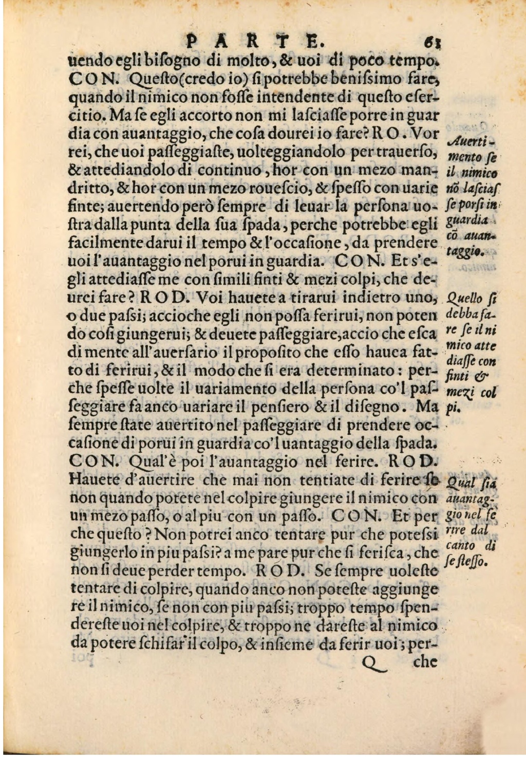 vendo egli bisogno di molto, & voi di poco tempo. CON. Questo (credo io) si potrebbe benissimo fare, quando il nimico non fosse intendente di questo esercitio. Ma se egli accorto non mi lasciasse porre in guardia con avantaggio, che cosa dovrei io fare? RO. Vorrei, che voi passeggiaste, volteggiandolo per traverso, & attediandolo di continuo, hor con un mezo mandritto, & hor con un mezo rovescio, & spesso con varie finte; avertendo però sempre di levar la persona vostra dalla punta della sua spada, perche potrebbe egli facilmente darvi il tempo & l'occasione, da prendere voi l'avantaggio nel porvi in guardia. CON. Et s'egli attediasse me con simili finti & mezi colpi, che devrei fare? ROD. Voi havete a tirarvi indietro uno, o due passi; accioche egli non possa ferirvi, non potendo cosi giungervi; & devete passeggiare, accio che esca di mente all'aversario il proposito che esso havea fatto di ferirvi, & il modo che si era determinato: perche spesse volte il variamento della persona co'l passeggiare fa anco variare il pensiero & il disegno. Ma sempre state avertito nel passeggiare di prendere occasione di porvi in guardia co'l vantaggio della spada. CON. Qual'è poi l'avantaggio nel ferire. ROD. Havete d'avertire che mai non tentiate di ferire se non quando potete nel colpire giungere il nimico con un mezo passo, o al piu con un passo. CON. Et per che questo? Non potrei anco tentare pur che potessi giungerlo in piu passi? a me pare pur che si ferisca, che non si deve perder tempo. ROD. Se sempre voleste tentare di colpire, quando anco non poteste aggiungere il nimico, se non con piu passi; troppo tempo spendereste voi nel colpire, & troppo ne dareste al nimico da potere schifar il colpo, & insieme da ferir voi; per-