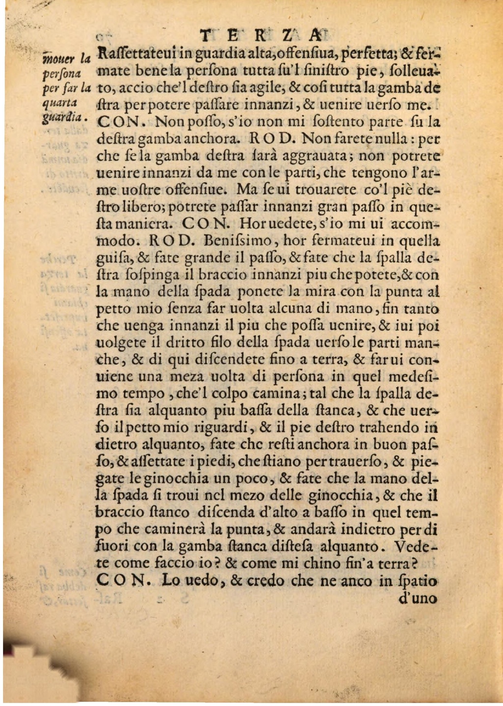 CON. Non posso, s'io non mi fostento parte fu la destra gamba anchora. ROD. Non farete nulla: per che se la gamba destra sarà aggrauata; non potrete uenire innanzi da me con le parti, che tengono l'arme uostre offenfiue. Ma fe ui trouarete co'l piè destro libero; potrete passar innanzi gran passo in questa maniera. CON. Horuedete, s'io mi ui accommodo. ROD. Benissimo, hor fermateui in quella guifa, & fate grande il passo, & fate che la spalla destra fofpinga il braccio innanzi piu che potete,& con la mano della fpada ponete la mira con la punta al petto mio senza far uolta alcuna di mano, fin tanto che uenga innanzi il più che possa ucnire, & iui poi uolgete il dritto filo della spada uerfo le parti manche, & di qui discendete fino a terra, & farui conuiene una meza uolta di perfona in quel medefimo tempo, che'l colpo camina; tal che la spalla destra fia alquanto piu bassa della stanca, & che uerfo ilpetto mio riguardi, & il pie destro trahendo in dietro alquanto, fate che resti anchora in buon passo, & assettate i piedi, che stiano per trauerfo, & piegate le ginocchia un poco, & fate che la mano della fpada fi troui nel mezo delle ginocchia, & che il braccio stanco discenda d'alto a basso in quel tempo che caminerà la punta, & andarà indictro per di fuori con la gamba stanca distesa alquanto. Vedete come faccio io? & come mi chino fin'a terra? CON. Lo uedo, & credo che ne anco in fpatio