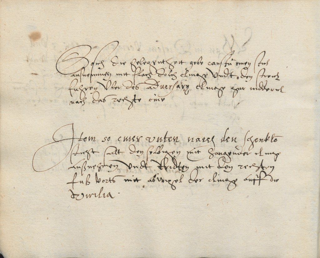 So sich die gelegentheit gebe canstu einen stich ausnemmen mit flach dolch clinge undt den streich fuhren uber des adversarii clinge gar nidderich nach das rechte cnie.