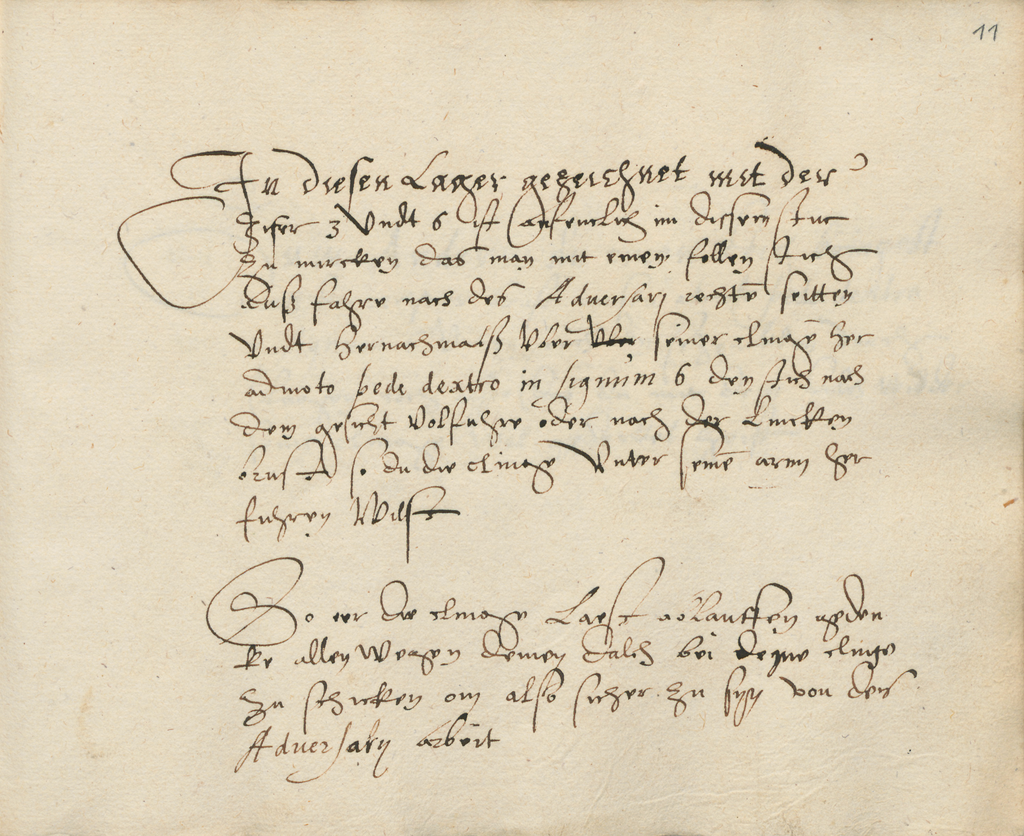 In diesen lager gezeichnet mit der zifer 3 undt 6 ist anfenclich im diesem stuc zu mercken das man mit einen follen stich außfahre nach des adversari rechten seitten undt hernachmalß uber seiner clinge her admoto pede dextro in signum 6 den stich nach dem gesicht volfuhre oder nach der lincken brust so du die clinge unter seinen arm her fuhren wilst.