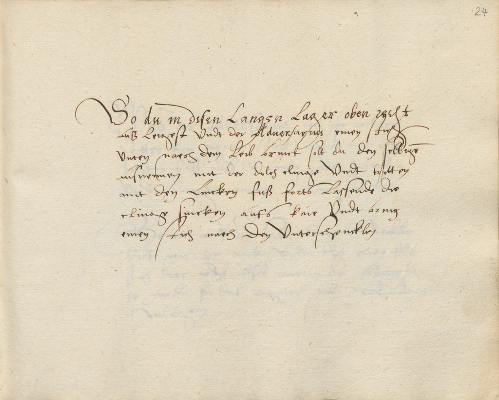 So du in disen langen lager oben recht außleigest undt der adversarius einen stich unten naech dem leib brinct solt du den selbigen ausnemmen mit der dolch clinge undt tritten mit den lincken fuß forts lassende die clinge sincken aufs knie undt bring einen stich naech den unterschencklen.