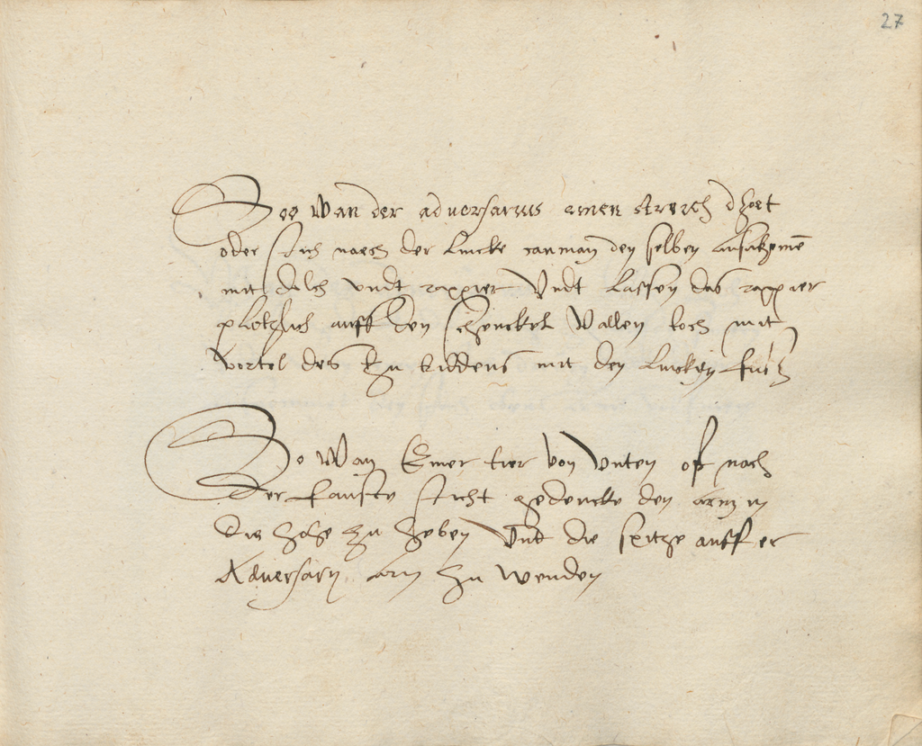 Soo wan der adversarius einen streich dhoet oder stich naech der lincke can man den selben ausnhemen mit dolch undt rappier undt lassen das rappier plotzlich auff den schenckel vallen toch mit vortel des zutriddens mit den lincken fuß.