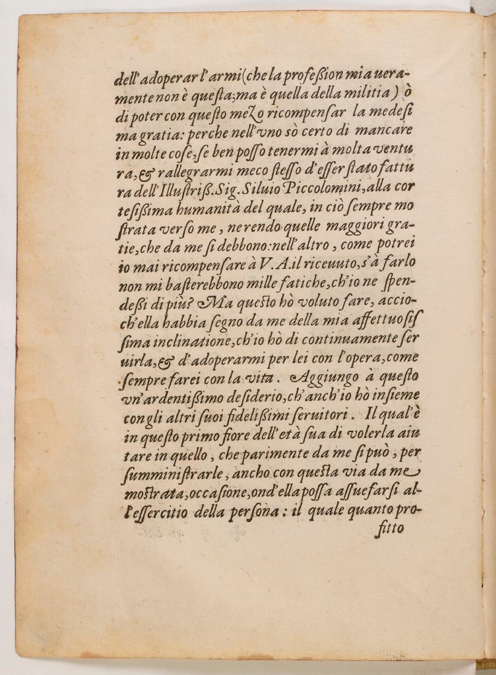 dell’ adoperar l’armi (che la profession mia veramente non e questa; ma e quella di militia) o di poter con questo mezzo ricompensar la medesima gratia: perche nell’uno so certo di mancare in molte cose, se ben posso tenermi a molta ventura, & rallegrarmi meco stesso d’esser stato fattura dell'Illustrißimo Signore Silvio Piccolomini, alla cortesissima humanita del quale, in cio sempre mostrata verso me, ne rendo quelle maggiori gratie, che da me si debbono: nell’altro, come potrei io mai ricompensare a Vostra Altezza il ricevuto, s’a farlo non mi bastrebbono mille fatiche, ch’io ne spendessi di piu? Ma questo hò voluto fare, accioch'ella habbia segno da me della mia affettuosissima inclinatione, ch'io ho di continuamente servirla, & d'adoperarmi per lei con l'opera, come sempre farei con la vita. Aggiungo a questo un'ardentissimo desiderio, ch'anch'io ho insieme con gli altri suoi fidelissimo servitori. Il qual'è in questo primo fiore dell'et à sua di volerla aiutare in quello, che parimente da me si puo, per sumministrarle, ancho con questa via da me mostrata, occasione, ond'ella possa assuefarsi all'essercitio della persona: il quale quanto pro-