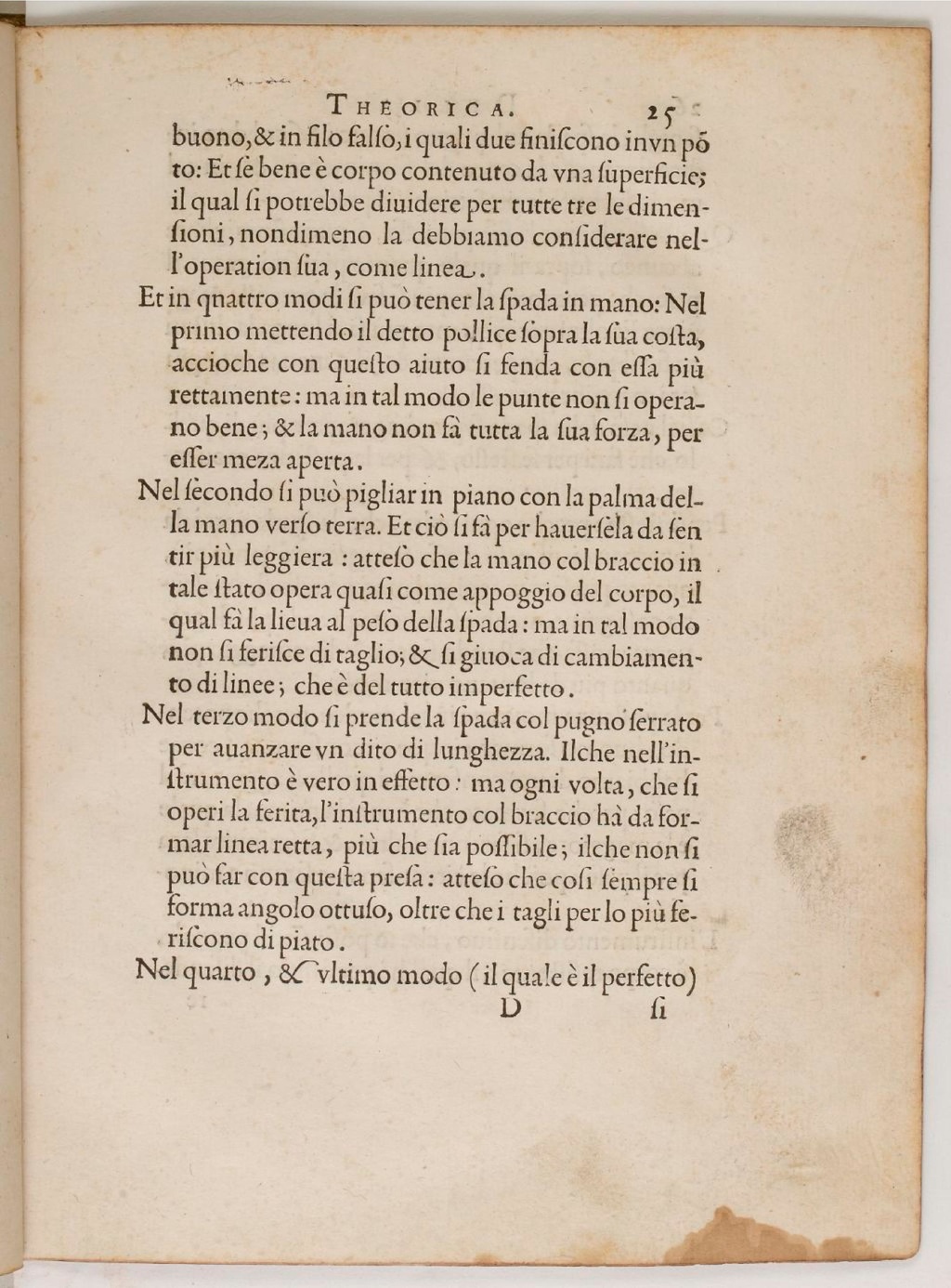 Nel secondo si può pigliar in piano con la palma della mano verso terra. Et ciò si fà per haversela 29 da fen tir più leggiera: atteso che la mano col braccio in tale stato opera quasi come appoggio del corpo, il qual fà la lieua al peso della spada: ma in tal modo non si ferisce di taglio; & si giuoca di cambiamento di linee; che è del tutto imperfetto.
