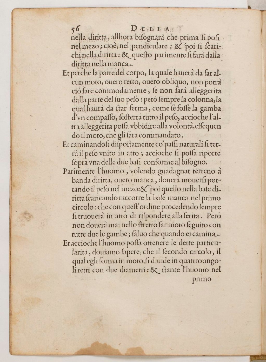 Parimente l’huomo, volendo guadagnar terreno à banda diritta, overo manca, douerà moversi portando il peso nel mezo: & poi quello nella base disritta scaricando raccorre la base manca nel primo circolo: che con quest’ordine procedendo semptre si truoverà in atto di rispondere alla ferita. Però non douerà mai nello stretto far moto seguito con tutte due le gambe; saluo che quando ei camina.