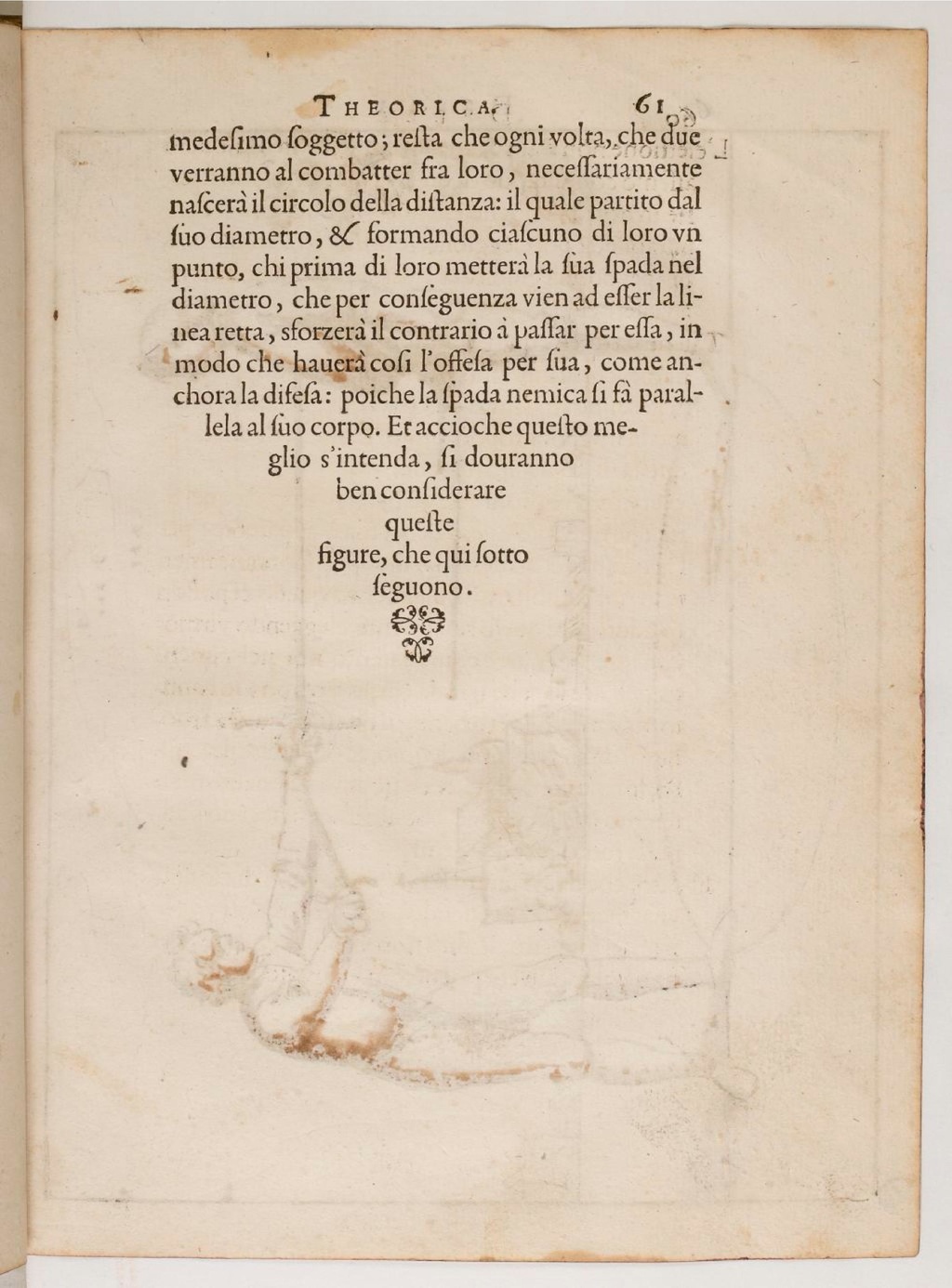 medesimo soggetto; resta che ogni volta, che due verranno al combatter frea loro, necessariamente nascerà il circolo della distanza: il quale partito dal suo diametro, & formando ciascuno di loro un punto, chi prima di loro metterà la sua spada nel diametro, che per conseguenza vien ad esser la linea retta, sforzerà il contrario à passar per essa, in modo che hauerà cosi l’offesa per sua, come anchora la difesa: poiche la spada nemica fi fà parallela al suo corpo. Et accioche questo meglio s’intenda, si douranno ben considerare queste figure, che qui sotto seguono.