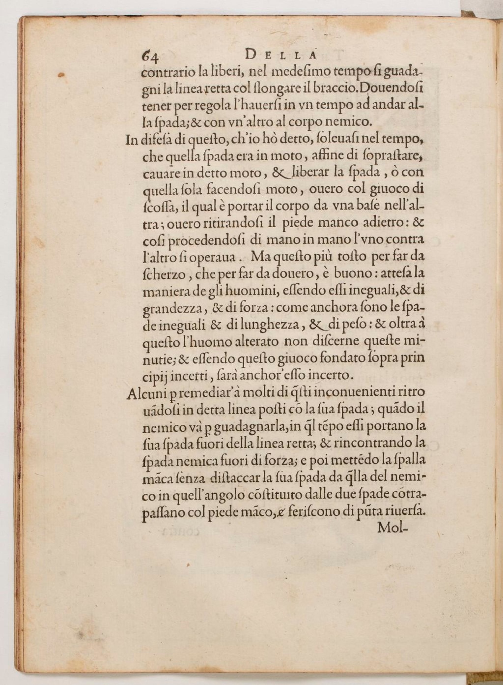 In difesa di questo, ch’io hò detto, soleuasi nel tempo, che quella spada era in moto, affine di soprastare, cauare in detto moto, & liberar la spada, ò con quella sola facendosi moto, overo col giuoco discossa, il qual è portar il corpo da una base nell’altra; overo ritirandosi il piede manco adetro: & cosi procedendosi di mano in mano l’uno contra l’altro si operava. Ma questo più tosto per far da scherzo, che per far da douero, è buono: attesa la maniera de gli huomini, essendo essi ineguali, & di grandezza, & di forza: come anchora sono le spade ineguali & di lunghezza, & di peso: & oltra à questo l’huomo alterato non discerne queste minutie; & essendo questo giuoco fondato sopra principii incerti, sarà anchor’eso incerto.