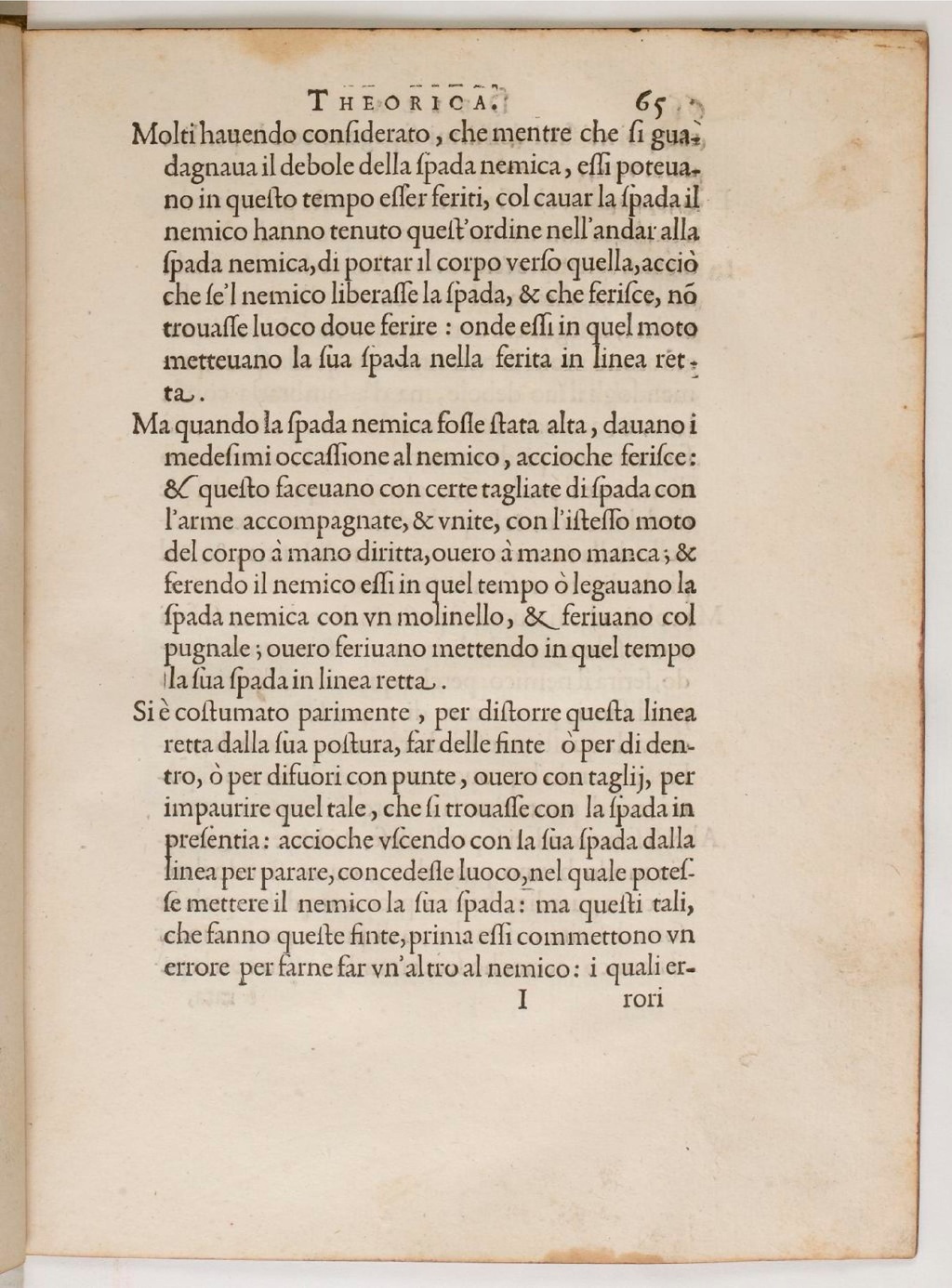 Molti havendo considerato, che mentre che si guadagnava il debole della spada nemica, essi potevano in questo tempo esser feriti, col cavar la spada il nemico hanno tenuto quest’ordine nell’andar alla spada nemica, di portar il corpo verso quella, acciò che se’l nemico liberasse la spada, & che ferisce, nó trovasse luoco dove ferire: onde essi in quel moto mettevano la sua spada nella ferita in linea retta.