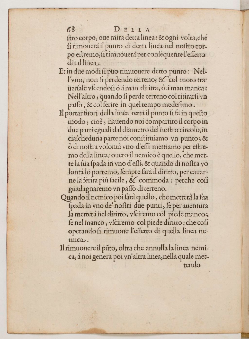 Quando il nemico poi sarà quello, che metterà la sua spada in uno de’nostri due punti, se per aventura la metterà nel diritto usciremo col piede manco; se nel manco, usciremo colpiede diritto: che cosi operando si rimuove l’essetto di quella linea nemica.
