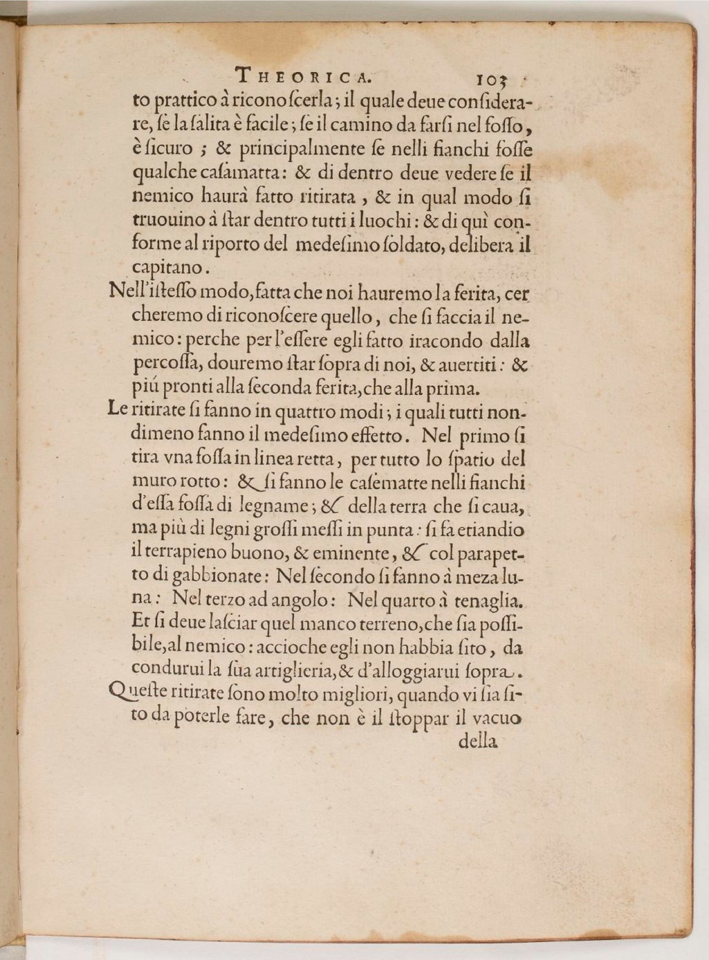 Et si deue lasciar quel manco terreno, che sia possibile, al nemico: accioche egli non habbia sito, da condurui la sua artriglieria, & d’alloggiarui sopra. Queste ritirate sono molto migliori, quando vi sia sito da poterle fare, che non è il stoppar il vacuo
