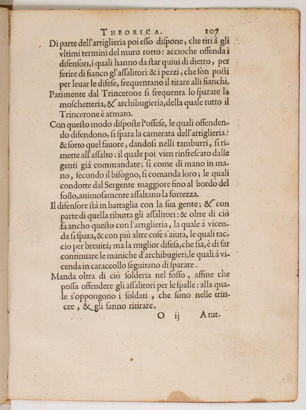 Con questo modo disposte l’offese, le quali offendendo difendono, si spara la camerata dell’artiglieria: & sotto quel favore, dandosi nelli tamburri, si rimette all’assalto: il qual poi vien rinfrescato dalle genti già commandate; si come di mano in mano, secondo il bisogno, si comanda loro; le quali condotte dal Sergente maggiore fino al bordo del fosso, animosamente assaltano la fortezza.