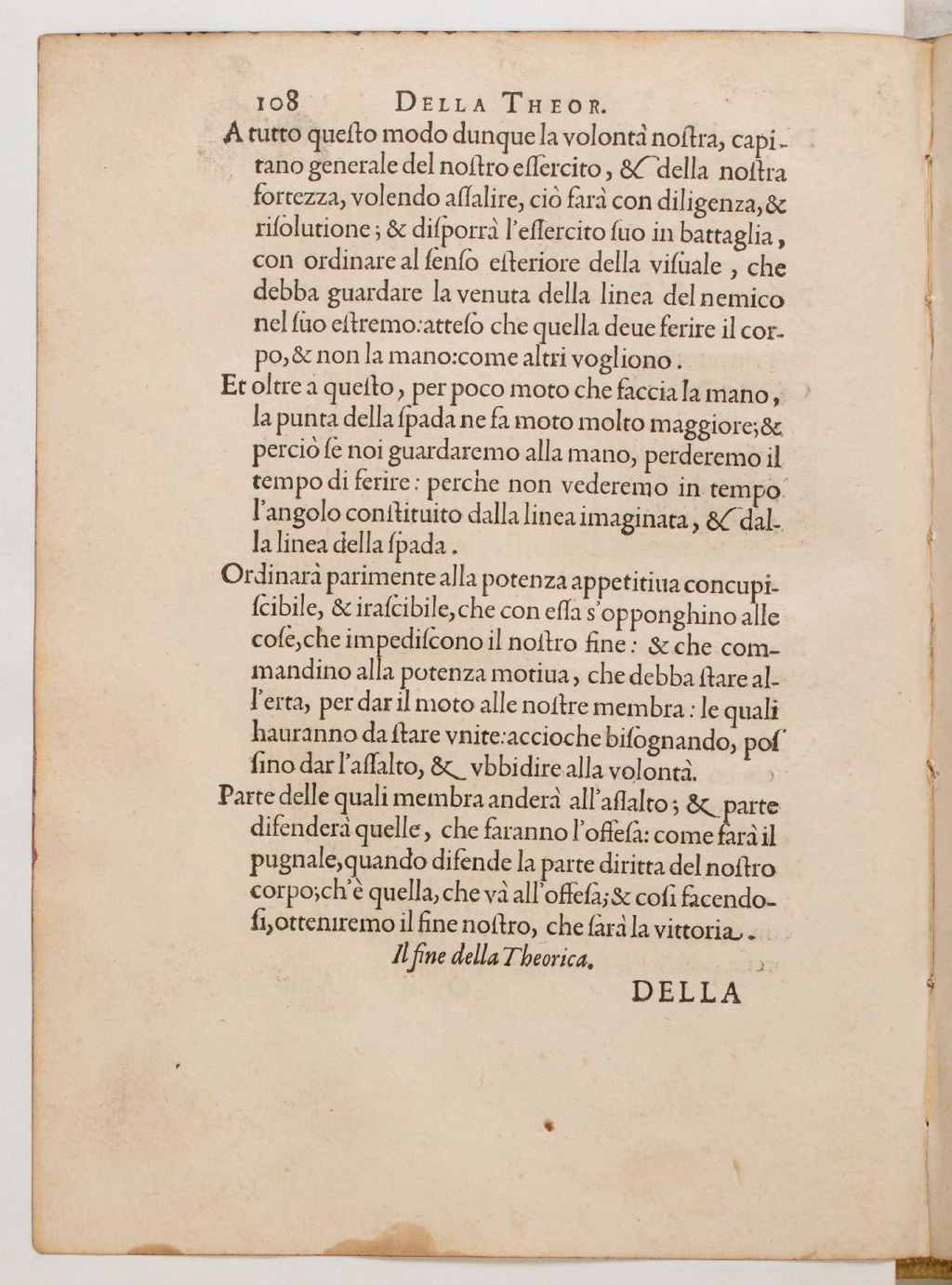 Et oltre a questo, per poco moto che faccia la mano, la punta della spada ne fa moto molto mggiore; & perciò se noi guardaremo alla mano, perderemo il tempo di ferire: perche non vederemo in tempo l’angolo constituito dalla linea imaginata, & dalla linea della spada.