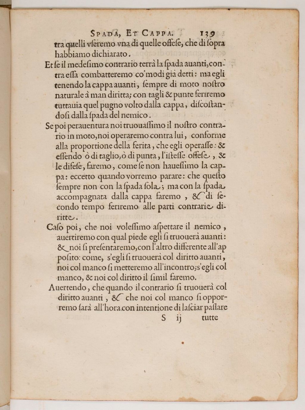 Etr se il medesimo contrario terrà la spada avanti, contra essa combatteremo co’modi già detti: ma egli tenendo la cappa avanti, sempre di moto nostro naturale à man diritta; con tagli & punte feriremo tuttavia quwl pugno volto dalla cappa, discostandosi dalla spada del nemico.
