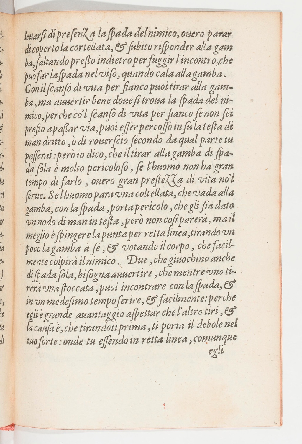 Con il scanso di vita per fianco puoi tirar alla gamba, ma auuertir bene doue si troua la spada del nimico, perche co’l scanso di vita per fianco se non sei presto a paßar via, puoi esser percosso in su la testa di man dritto, ò di rouerscio secondo da qual parte tu passerai: però io dico, che il tirar alla gamba di spada sola è molto pericoloso, se l’huomo non ha gran tempo di farlo, ouero gran prestezza di vita no’l serue. Se l’huomo para vna coltellata, che vada alla gamba, con la spada, porta pericolo, che gli sia dato vn nodo di man in testa, però non cosi parerà, ma il meglio è spingere la punta per retta linea, tirando vn poco la gamba à se, & votando il corpo, che facilmente colpirà il nimico. Due, che giuochino anche di spada sola, bisogna auuertire, che mentre vno tirerà vna stoccata, puoi incontrare con la spada, & in vn medesimo tempo ferire, & facilmente: perche egli è grande auantaggio aspettar che l’altro tiri, & la causa è, che tirandoti prima, ti porta il debole nel tuo forte: onde tu essendo in retta linea, comunque