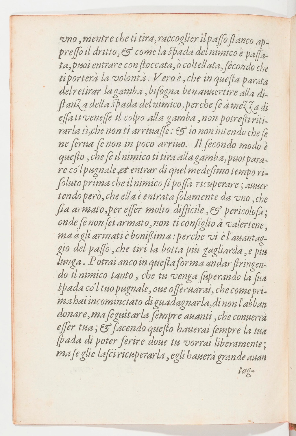 vno, mentre che ti tira, raccoglier il passo stanco appresso il dritto, & come la spada del nimico è passata, puoi entrare con stoccata, ò coltellata, secondo che ti porterà la volontà. Vero è, che in questa parata del retirar la gamba, bisogna ben auuertire alla distanza della spada del nimico, perche se à mezza di essa ti venesse il colpo alla gamba, non potresti ritirarla sì, che non ti arriuasse: & io non intendo che se ne serua se non in poco arriuo. Il secondo modo è questo, che se il nimico ti tira alla gamba, puoi parare co’l pugnale, et entrar di quel medesimo tempo risoluto prima che il nimico si possa ricuperare; auuertendo però, che ella è entrata solamente da vno, che sia armato, per esser molto difficile, & pericolosa; onde se non sei armato, non ti consiglio à valertene, ma à gli armati è bonißima: perche vi è l’auantaggio del passo, che tiri la botta più gagliarda, e piu lunga. Potrai anco in questa forma andar stringendo il nimico tanto, che tu venga superando la sua spada co’l tuo pugnale, oue osseruarai, che come prima hai incominciato di guadagnarla, di non l’abbandonare, ma seguitarla sempre auanti, che conuerrà esser tua; & facendo questo hauerai sempre la tua spada di poter ferire doue tu vorrai liberamente; ma se glie lasci ricuperarla, egli hauerà grande auan-