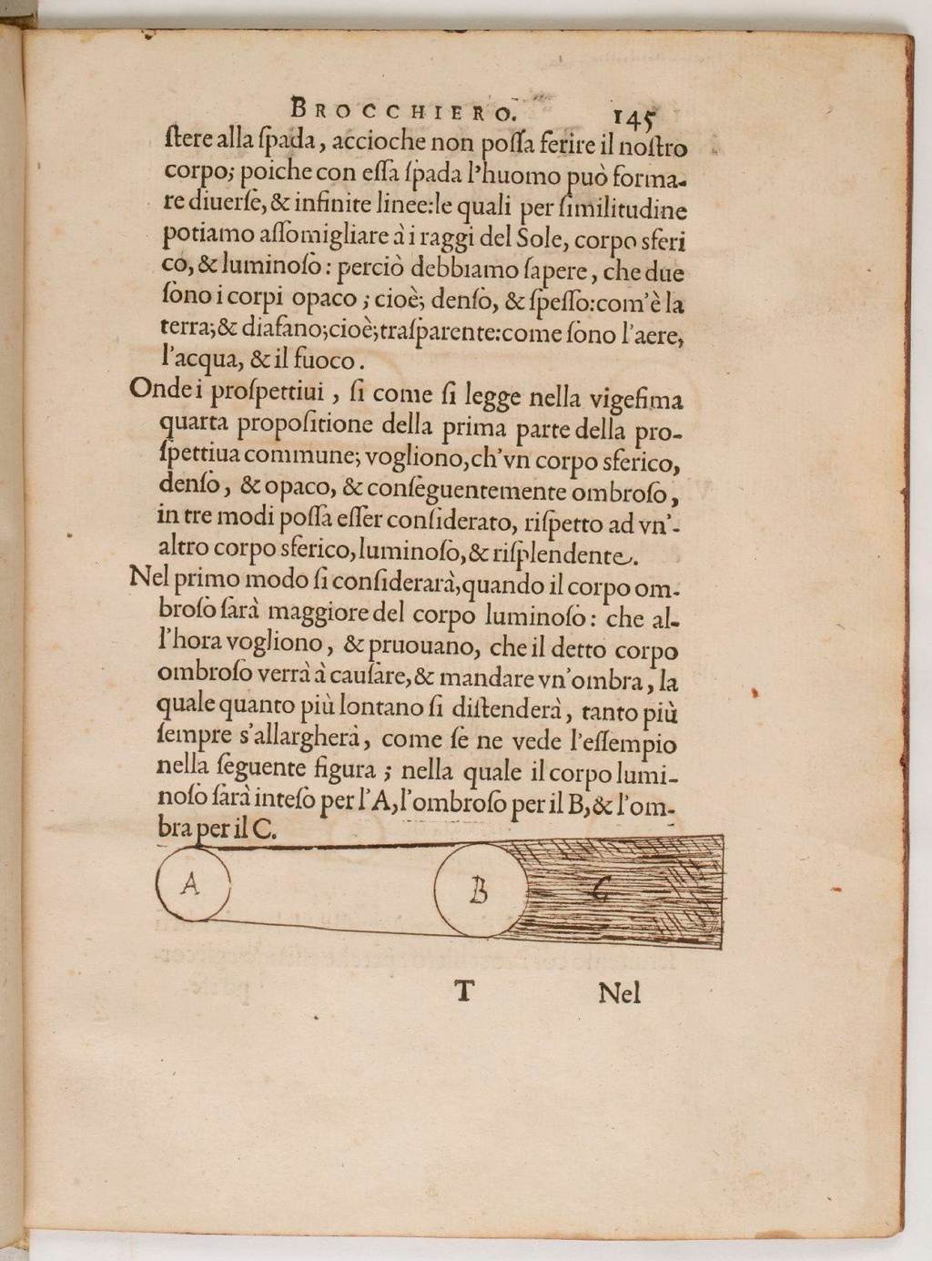 Nel primo modo si considerarà, quando il corpo ombroso sarà maggiore del corpo luminoso: che all’hora vogliono, & pruovano, che il detto corpo ombroso verrà à causare, & mandare un’ombra, la quale quanto più lontano si distenderà, tanto più sempre s’allargherà, come se ne vede l’essempio nella seguente figura; nella quale il corpo luminoso sarà inteso per l’A, l’ombroso per il B, & l’ombra per il C.