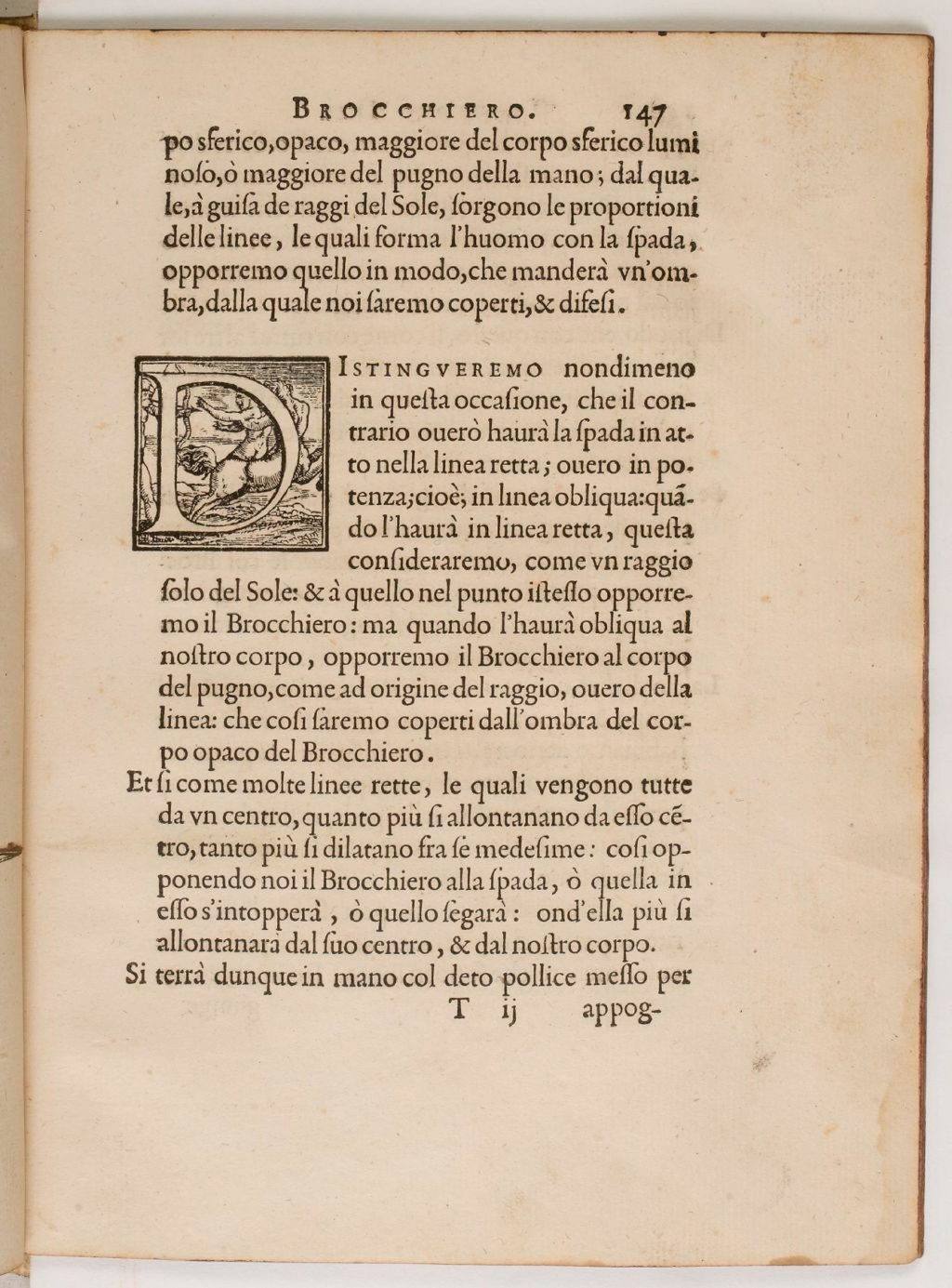 DISTINGVEREMO nondimeno in questa occasione, che il contrario overò haurà la spada in atto nella linea retta; overo in potenza cioè; in linea obliqua: quádo l’haurà in linea retta, questa consideraremo, come un raggio solo del Sole: & à quello nel punto istesso opporremo il Brocchiero: ma quando l’haurà obliqua al nostro corpo, opporremo il Brocchiero al corpo del pugno, come ad origine del raggio. Overo della linea: che cosi saremo coperti dall’ombra del corpo opaco del Brocchiero.
