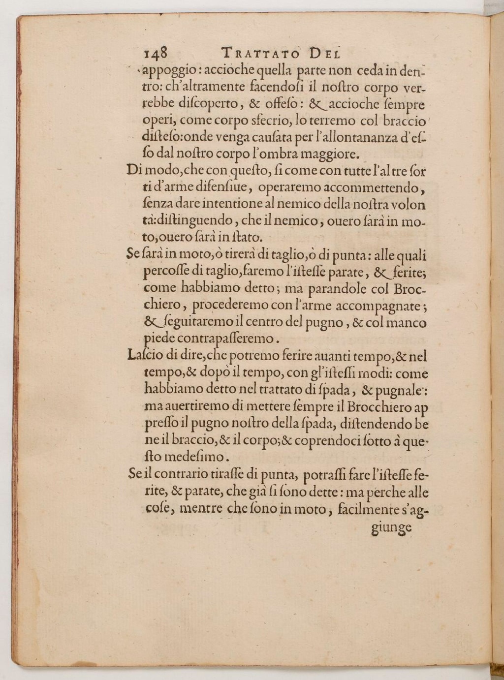 Se sarà in moto, ò tirerà di taglio, ò di punta: alle quali percosse di taglio, faremo l’istesse parate, & ferite; come habbiamo detto; ma parandole col Brocchiero, procederemo con l’arme accompagnate; & seguitaremo il centro del pugno, & col manco piede contrapasseremo.