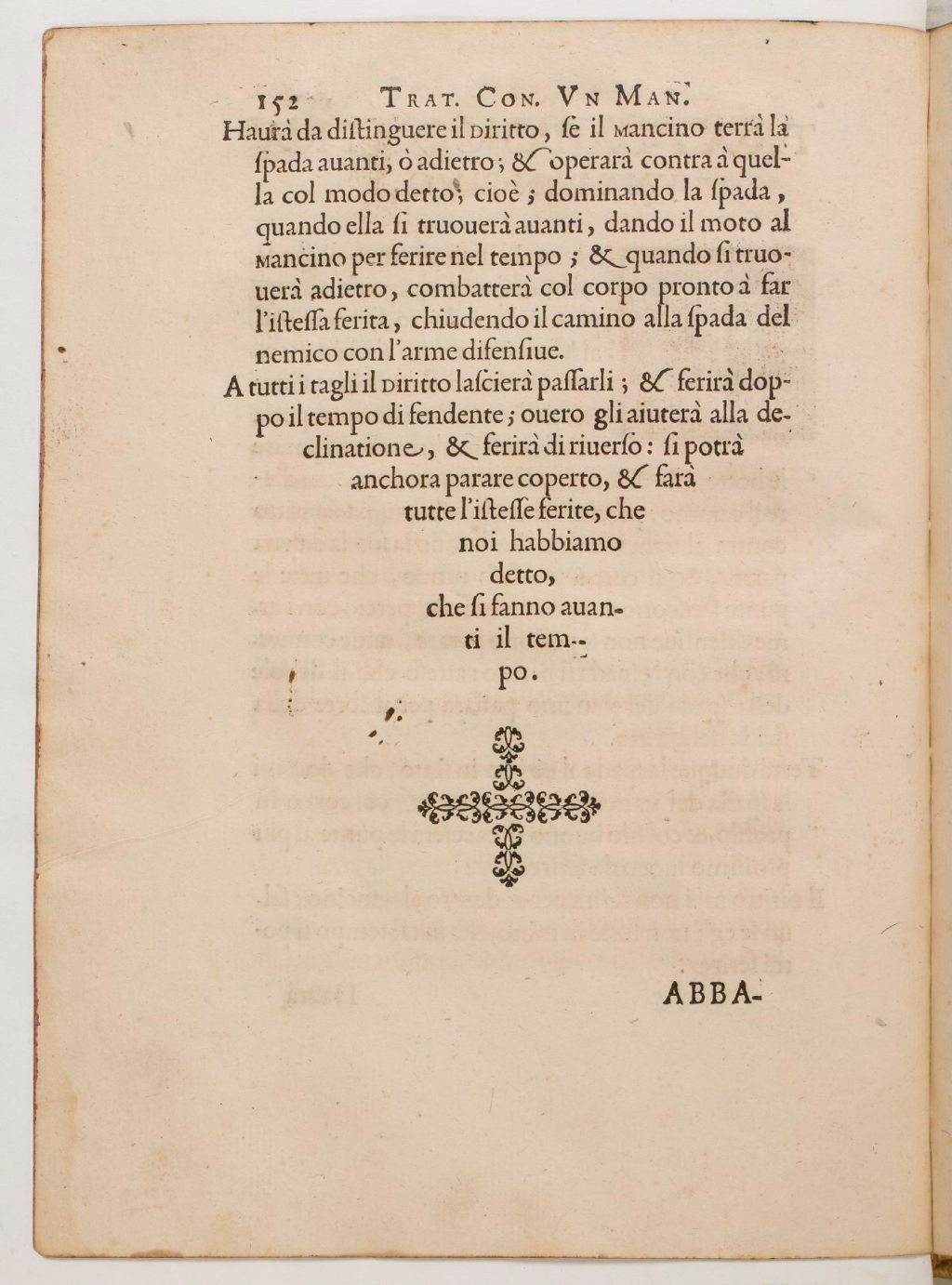 Haurà da distinguere il diritto, se il mancino terrà la spada avanti, ò adietro; & operarà contra à quella col modo detto; cioè; dominando la spada, quando ella si truoverà avanti, dando il moto al mancino per ferire nel tempo; & quando si truoverà adietro, combatterà col corpo pronto à far l’istessa ferita, chiudendo il camino alla spada del nemico con l’arme difensive.