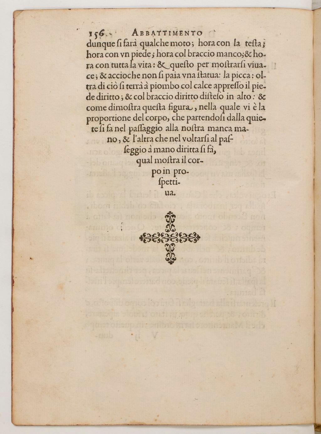 dunque si farà qualche moto; hora con la testa; hjora con un piede; hora col braccio manco; & hora con tutta la vita: & questo per mostrarsi viuace; & accioche non si paia una statua: la picca: oltra di ciò si terrà à piombo col calce appresso il piede diritto; & col braccio diritto disteso in alto: & come dimostra questa figura, nella quale vi è la proportione del corpo, che partendosi dalla quiete si fa nel passaggio alla nostra manca mano, & l’altra che nel voltarsi al passeggio à mano diritta si fà, qual mostra il corpo prospettiva.