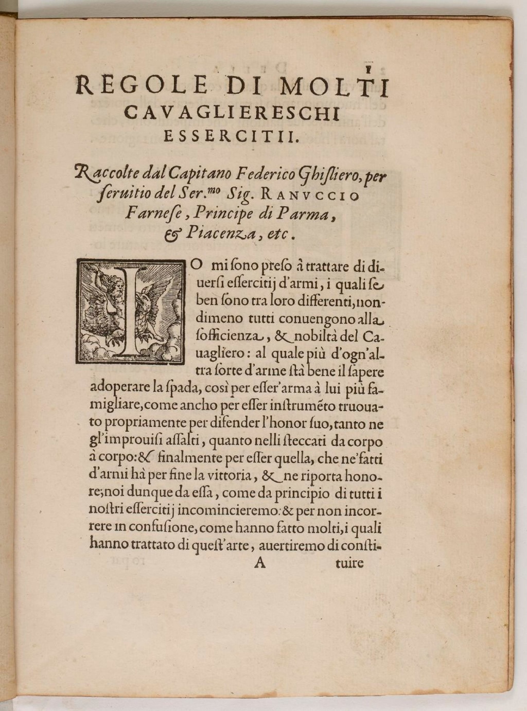 ⅠO mi sono preso a trattare di diversi essercitii d'armi, i quali se ben sono tra loro differenti, nondimeno tutti convengono alla sofficienza, & nobilta del Cavagliero: al quale piu d'ogn'altra sorte d'arme sta bene il sapere adoperare la spada, cosi per esser instrumento truovato prompriamente per difender l'honor suo, tanto ne gl'improvisi assalti, quanto nelli steccati da corpo a corpo: & finalmente per esser quella, che ne'fatti d'armi ha per fine la vittoria, & ne riporta honore; noi dunque da essa, come da principio di tutti i nostri essercitii incomniciaremo: & per non incorrere in confusione, come hanno fatto molti, i quali hanno trattato di quest'arte, avertiremo di consti-