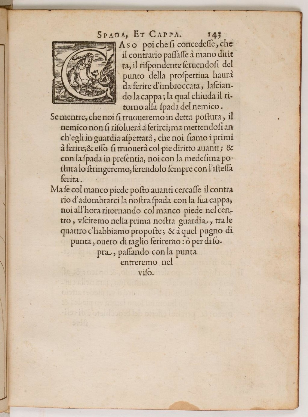 CAso poi che si concedesse, che il contrario passasse à mno diritta, il rispondente seruendosi del punto della prospettiua haurà da ferire d’imbroccatta, lasciando la cappa; la qual chiuda il ritorno alla spada del nemico.