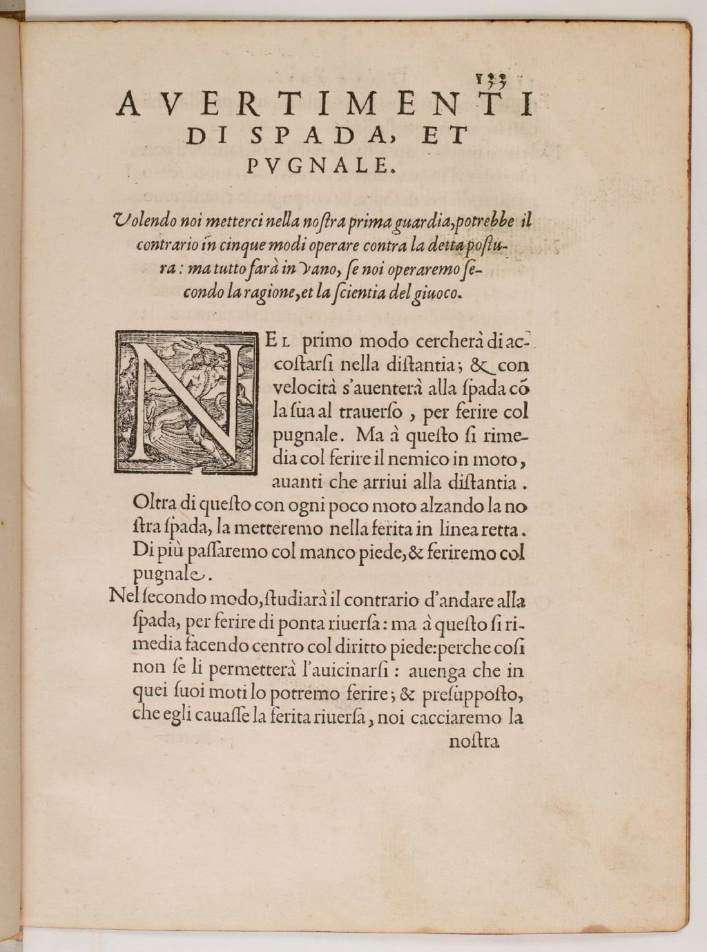 Volendo noi metterci nella nostra prima guardia, potrebbe il contrario in cinque modi operare contra la detta postura: ma tutto farà in vano, se noi operaremo secondo la ragione, et la scientia del givoco.