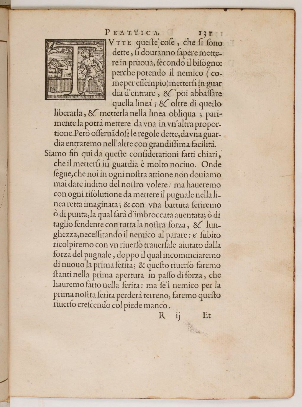 Siamo fin qui da queste considerationi fattin chiari, che il mettersi in guardia è molto nociuo. Onde segue, che noi in ogni nostra attione non douiamo mai dare inditio del nostro volere: ma haveremo con ogni risolutione da mettere il pugnale nella linea retta imaginata; & con una battuta feriremo ò di punta, la qual sarà d’imbroccata aventata; ò ditaglio fendente con tutta la nostra forza, & lunghezza, necessitando il nemico al parare: é subito ricolpiremo con un riverso traversale aiutato dalla forza del pugnale, doppo il qual incominciaremo di nuovo la prima ferita; & questo riverso faremo stanti nella prima apertura in passo di forza, che haveremo fatto nella ferita: ma se’l nemico per la prima nostra ferita perderà terreno, faremo questo riverso crescendo col piede manco.