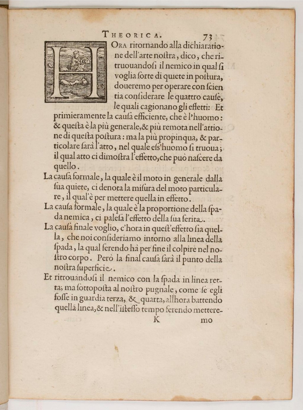 HOra ritornando alla dichiaratione dell’arte nostra, dico, che ritruovandosi il nemico in qal si voglia sorte di quiete in postura, doveremo per operare con scientia considerare le quattro cause, le quali cagionano gli effetti: Et primieramente la causa efficiente, che è l’huomo: & questa è la più generale, & più remota nell’attione di questa postura: ma la più propinqua, & particolare sarà l’atto, nel quale ess’huomo si truova; il qual atto ci dimostra l’effetto, che può nascere da quello.