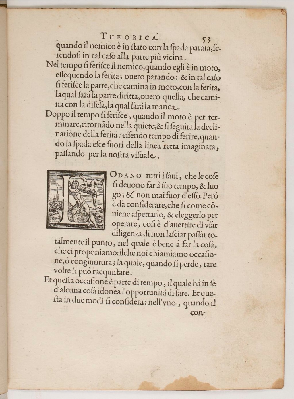 Nel tempo si ferisce il nemico, quando egli è in moto essequendo la ferita; overo parando: & in tal caso si ferisce la parte, che camina in moto, con la ferita, la qual sarà la parte diritta, overo quella, che camina con la difesa, la qual farà la manca.