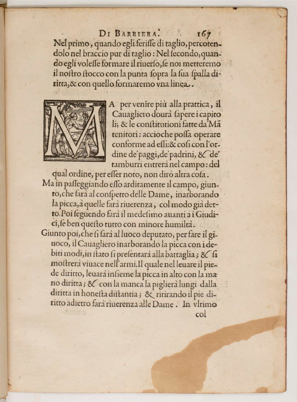 Giunto poi, che si sarà al luoco deputato, per fare il giuoco, il Cavagliero inarborando la picca con i debiti modi, in stato si presentarà alla battaglia; & si mostrerà viuace nell’armi. Il quale nel levare il piede diritto, levarà insieme la picca in alto con la mano diritta; & con la manca la pigierà lungi dalla diritta in honesta distantia; & ritirando il pie diritto adietro farà riverenza alle Dame. In ultimo