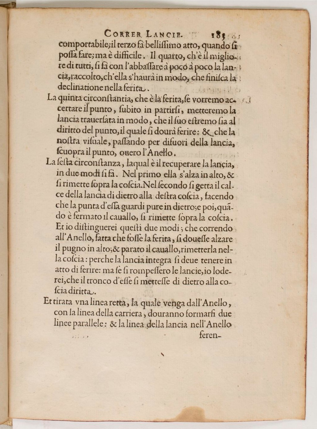 La quinta circonstantia, che è la ferita, se vorremo accertare il punto, subito in partirsi, se vorremo accertare il punto, subito in partirsi, metteremo la lancia traversata in modo, che il suo estremo sia al diritto del punto, il quale si dourà ferire: & che la nostra visuale, passando per difuori della lancia, scuopora il punto, overo l’Anello.