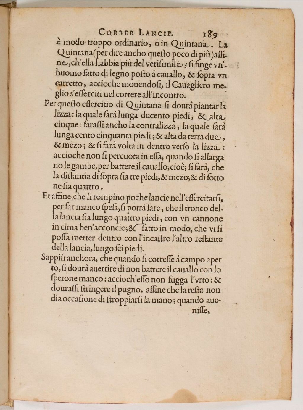Per questo essercitio di Quintana si dourà piantar la lizza: la quale sarà lunga ducento piedi, & alta cinque: farassin ancho la contra lizza, la quale sarà lunga centro cinquanta piedi; & alta da terra due, & mezo; & si farà volta in dentro verso la lizza: accioche non si percuota in essa, quando si allerga no le gambe, per battere il cavallo; cioè; si farà, che la distantia di sopra sia tre piedi, & mezo; & di sotto ne sia quattro.