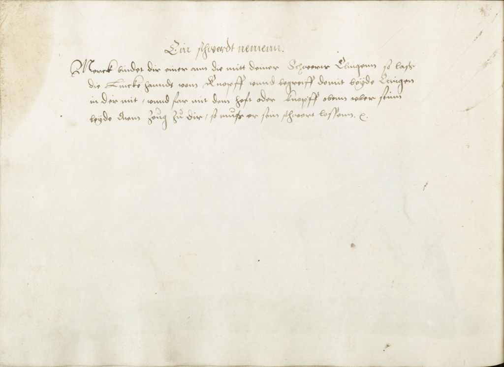 Merck bindet dir einer ann die mitt deiner Schwerts Clingenn so laß die Lincke hanndt vom Knopff unnd begreiff domit beyde Clingen in der mit, unnd far mit dem heft oder knopff obenn uber seinn beyde Arm zeug zu dir, so muß er sein schwert lassenn. ¶