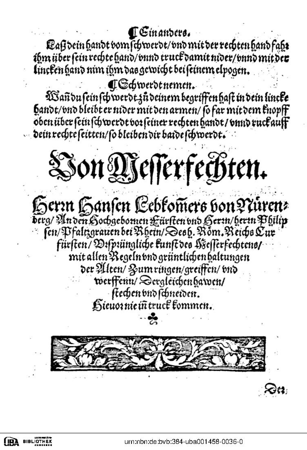 Herrn Hansen Lebkommers von Nürenberg, An den Hochgebornen Fürsten und Herrn, herrn Philipsen, Pfalzgraven bei Rhein, Des hochgebornen Römischen Reichs Curfürsten, Ursprüngliche kunst des Messerfechtens, mit allen Regeln und gründtlichen haltungen der Alten, zum ringen, greiffen, und werffenn, Dergleichen hawen, stechen und schneiden. Hievor nie inn truck kommen.