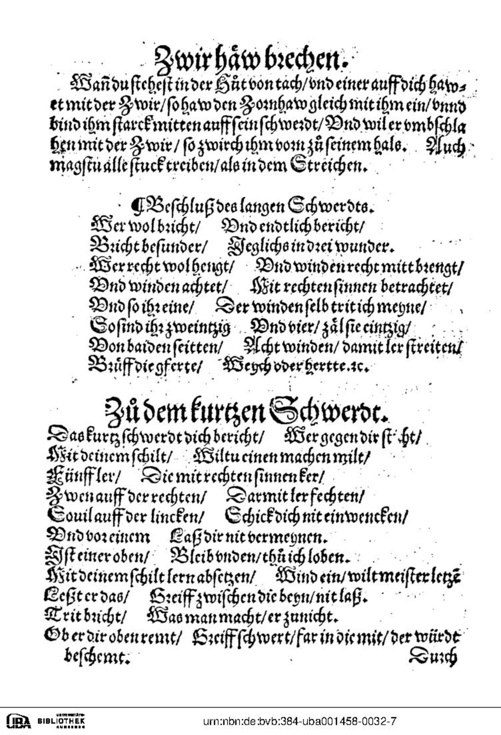 Wann du stehest in der Hut von tach, und einer auff dich hawet mit der Zwir, so haw den Zornhaw gleich mit ihm ein, unnd bind ihm starck mitten auff sein schwerdt, Und wil er umbschlahen mit der Zwir, so zwirch ihm vorn zu seinem hals.