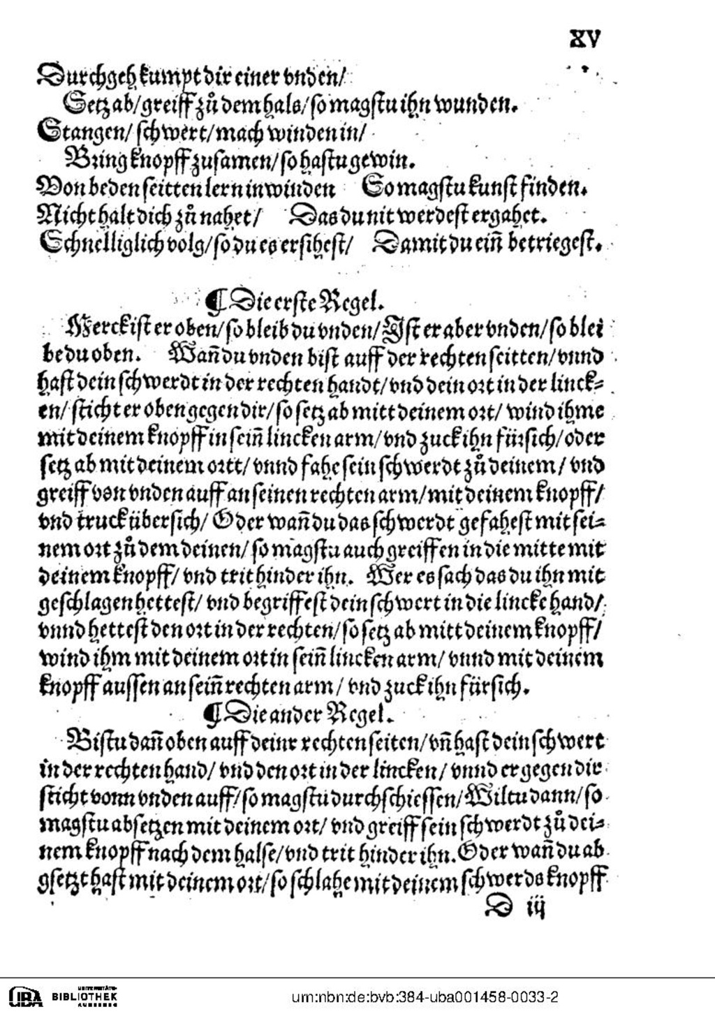 Merck ist er oben, so bleib du unden, Ist er aber unden, so bleibe du oben. Wann du unden bist auff der rechten seitten, unnd hast dein schwerdt in der rechten handt, und dein ort in der lincken, sitch er oben gegen dir, so setz ab mitt deinem ort, wind ihme mit deinem knopff in seinn lincken arm, und zuck ihn fürsich, oder setz ab mit deinem ortt, unnd fahe sein schwerdt zu deinem, und greiff ven[!] unden auff an seinen rechten arm, mit deinem knopff, und truck übersich, Oder wann du das schwerdt gefahest mit seinem ort zu dem deinen, so magstu auch greiffen in die mitte mit deinem knopff, und trit hinder ihn. Wer es sach das du ihn mit geschlagen hettest, und begreiffest dein schwert in die lincke hand, unnd hettest den ort in der rechten, so setz ab mitt deinem knopff, wind ihm mit deinem ort in seinn lincken arm, unnd mit deinem knopff aussen an seinn rechten arm, und zuck ihn fürsich.