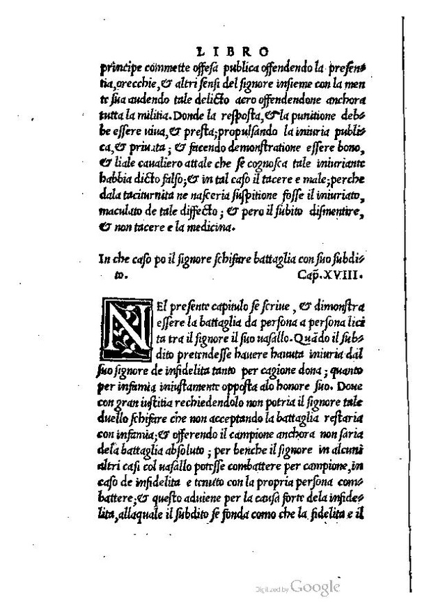 Nel presente capitulo se scrive, & dimonstra essere la battaglia da persona a persona licita tra il signore il suo vasallo. Quando il subdito pretendesse havere havuta iniuria dal suo signore de infidelita tanto per cagione dona; quanto per infamia iniustamente opposta alo honore suo. Dove con gran iustitia rechidendolo non potria il signore tale duello schifare che non accenptando la battaglia restaria con infamia; & offerendo il campione anchora non saria dela battaglia absoluto; per benche il signore in alcuni altri casi col vasallo potesse combattere, in caos de infidelita e tenuto con la propria persona combattere; & questo adviene per la causa forte dela infidelita, allaquale il subdito se fonda como che la fidelita e il