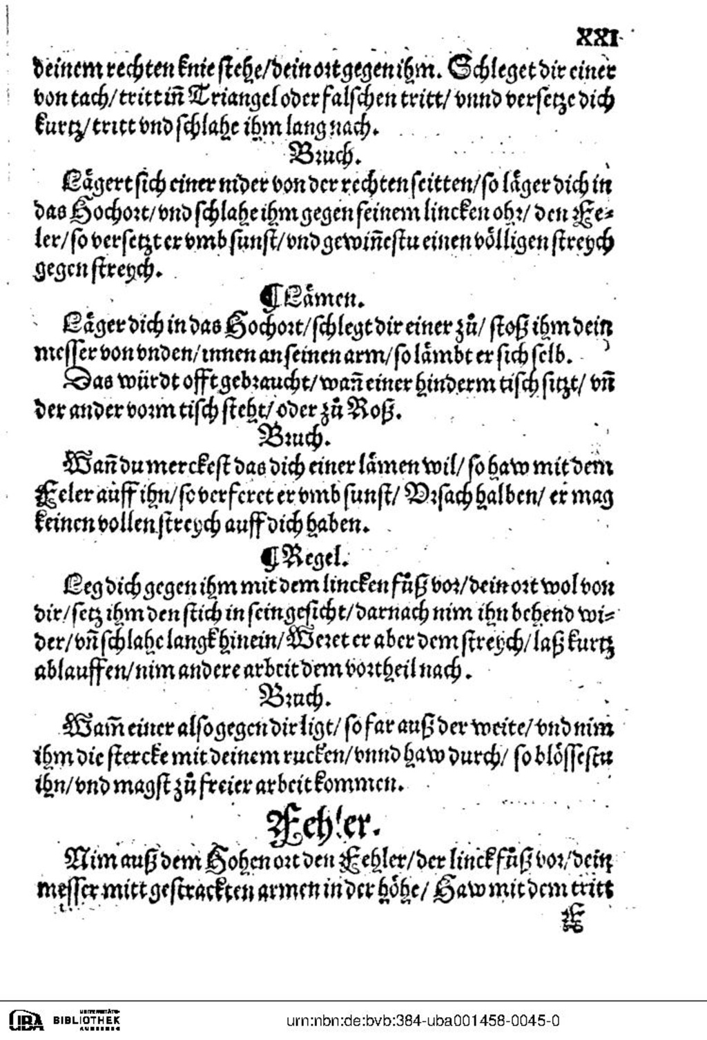 Wann du merckest das dich einer lämen will, so haw mit dem Feler auff ihn, so verferet er umb sunst, Ursach halben, er mag keinen vollen streych auff dich haben.