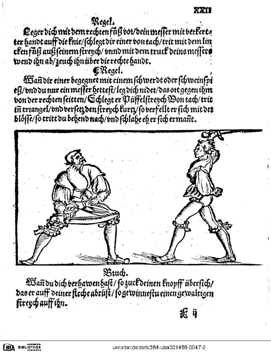 Wann dir einer begegnet mit einem schwerdt oder schweinspieß, und du nur ein messer hettest, leg dich nider, das ort gegen ihm von der rechten seitten, Schlegt er Püffelstreych Von tach, trit inn triangel, und versetz den streych kurtz, so verfellt er sich mit der blösse, so tritt du behend nach, und schlahe eh er sich ermannt.