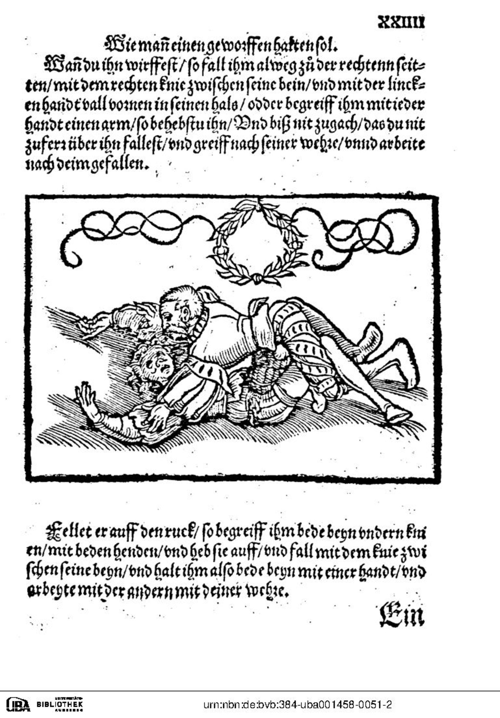Wann du ihn wirffest, so fall ihm alweg zu der rechtenn seitten, mit dem rechten knie zwischen seine bein, und mit der lincken handt vall vornen in seinen hals, odder begreiff ihm mit ieder handt einen arm, so behebstu ihn, Und biß nit zugach, das du nit zuferr über ihn fallest, und greiff nach seiner wehre, unnd arbeite nach deim gefallen.