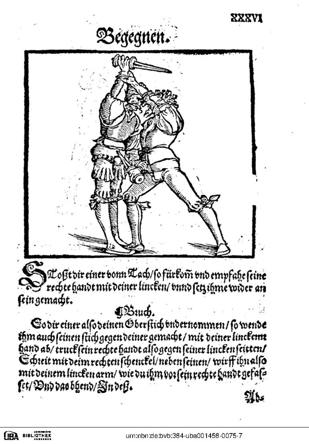 So dir einer also deinen Oberstich undernommen, so wende ihm auch seinen stich gegen deiner gemacht, mit deiner linckenn hand ab, truck sein rechte handt also gegen seiner lincken seitten, Schreit mit deim rechten schenckel, neben seinen, wirff ihn also mit deinem lincken arm, wie du ihm vor sein rechte handt gefasset, Und das bhend, In deß.