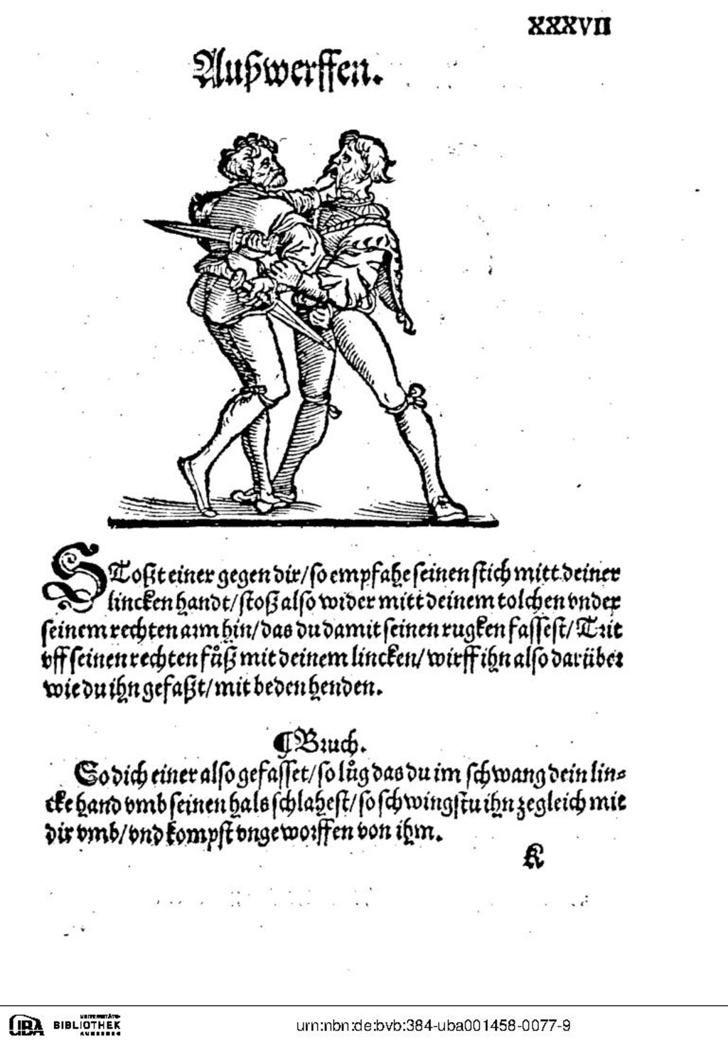 So dich einer also gefasset, so lug das du im schwang dein lincke hand umb seinen hals schlahest, so schwingstu ihn zegleich mit dir umb, und kompst ungeworffen von ihm.
