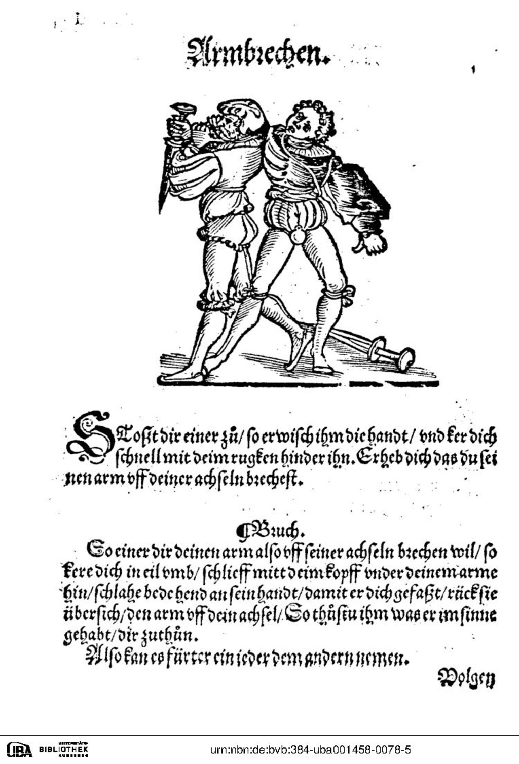 So einer dir deinen arm also uff seiner achseln brechen wil, so kere dich in eil umb, schlieff mitt deim kopff under deinem arme hin, schlahe bede hend an sein handt, damit er dich gefaßt, rück sie übersich, den arm uff dein achsel, So thustu ihm was er im sinne gehabt, dir zuthun.
